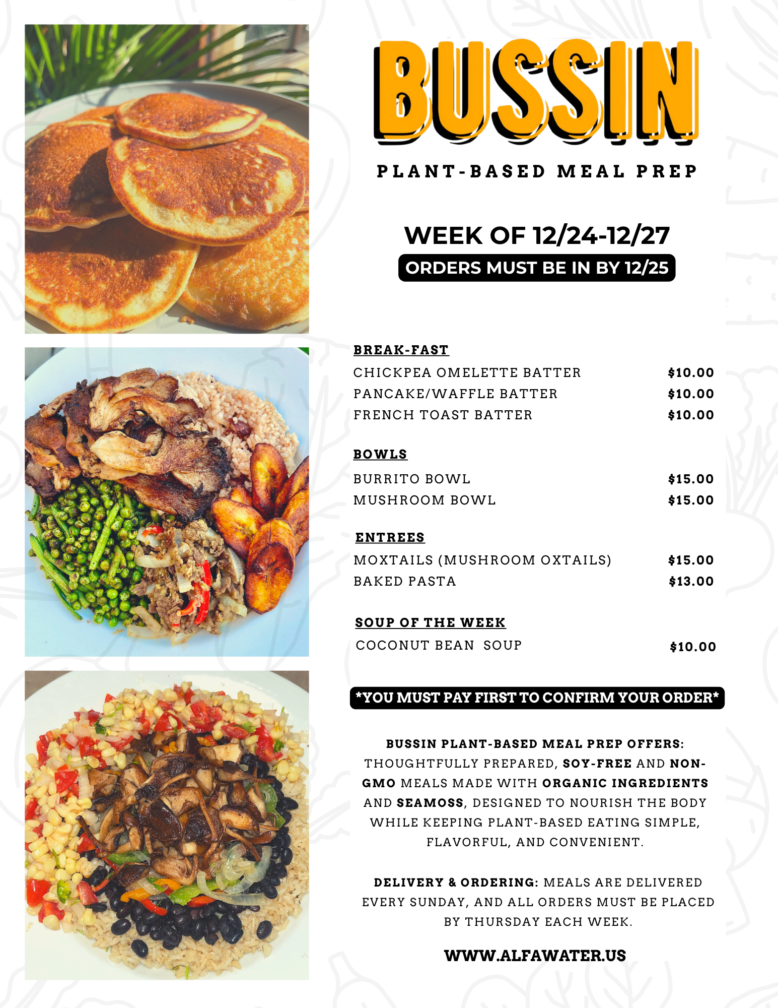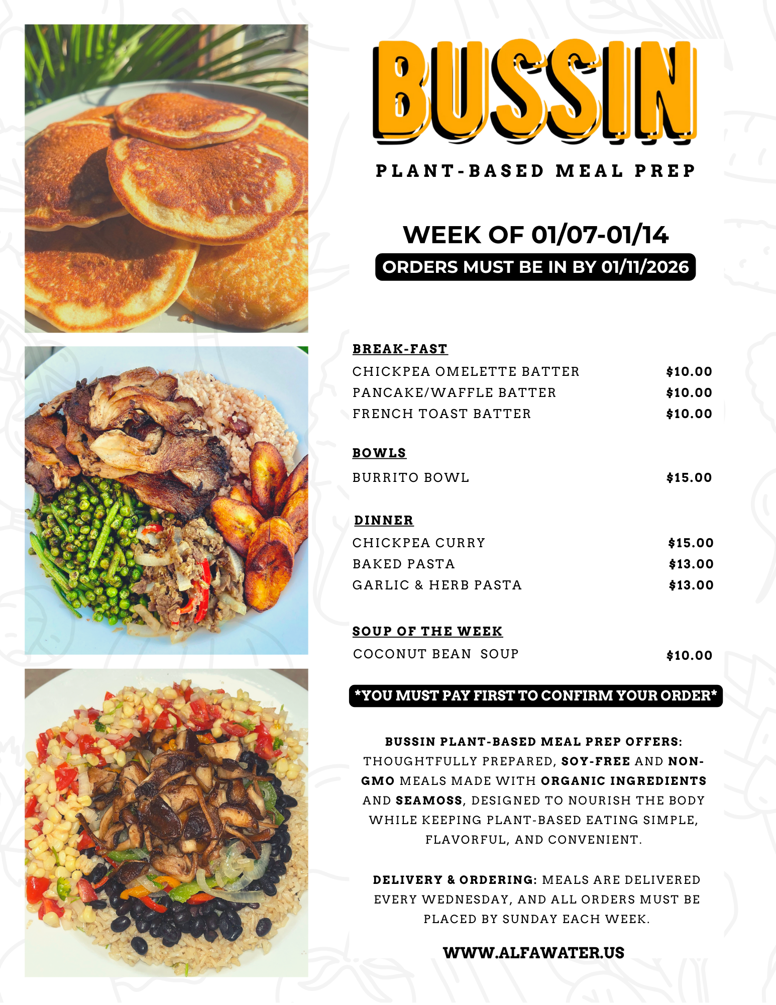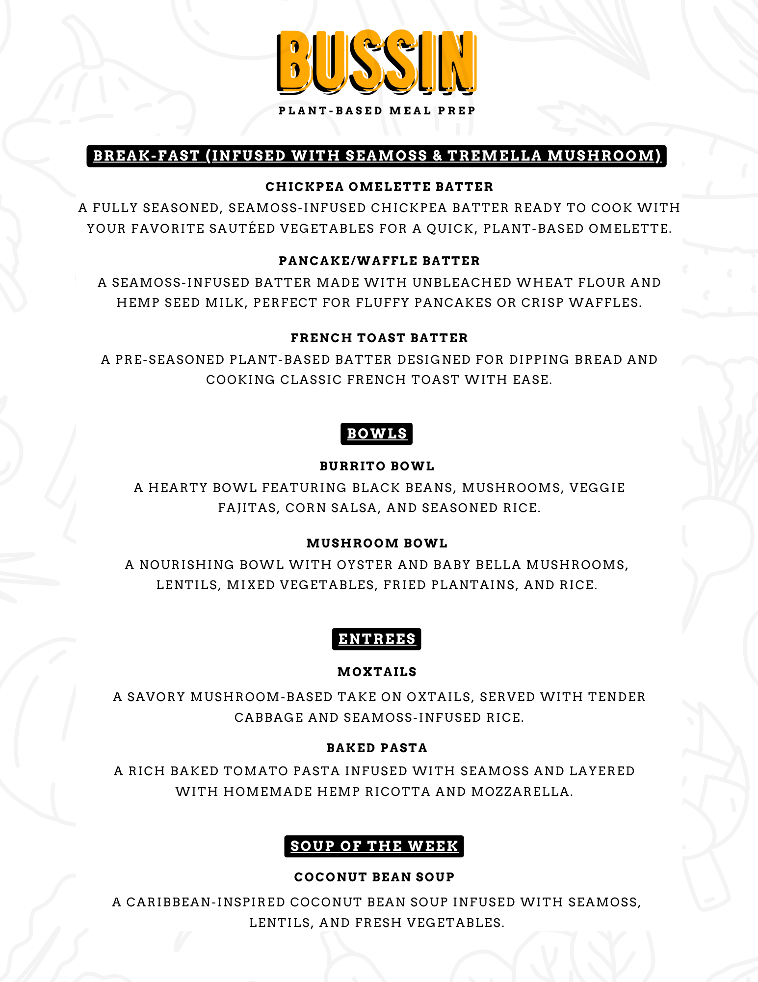 Bussin Plant-Based Meal Prep offers thoughtfully prepared, soy-free and non-GMO meals made with organic ingredients and Seamoss, designed to nourish the body while keeping plant-based eating simple, flavorful, and convenient.